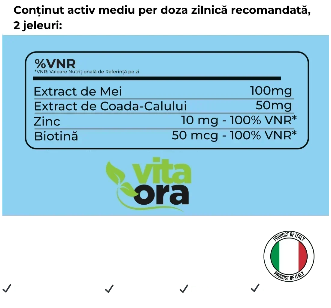 Conține Biotină, Zinc, Extract de Mei și Coada-Calului, ingrediente esențiale pentru întărirea firului de păr, susținerea creșterii unghiilor și menținerea unui aspect sănătos al pielii.